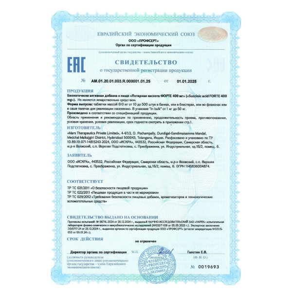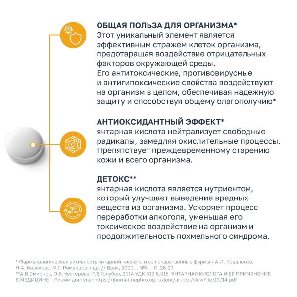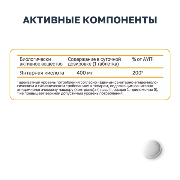 Янтарная кислота, кукурузный крахмал, микрокристаллическая целлюлоза (носитель), поливинилпирролидон (стабилизатор), оболочка таблетки (гидроксипропилметилцеллюлоза (загуститель), полиэтиленгликоль (стабилизатор), этилцеллюлоза (наполнитель), тальк (агент антислеживающий)), натрия крахмала гликолят (стабилизатор), кальциевая соль стеариновой кислоты (агент антислеживающий), диоксид кремния аморфный (агент антислеживающий).
