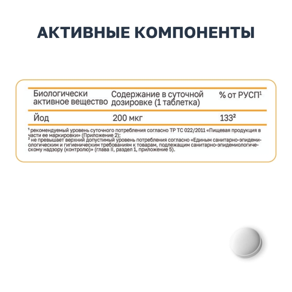 Кукурузный крахмал, микрокристаллическая целлюлоза (носитель), орто-фосфат кальция 2-замещенный (стабилизатор), оболочка таблетки (гидроксипропилметилцеллюлоза (загуститель), полиэтиленгликоль (стабилизатор), этилцеллюлоза (наполнитель), тальк (агент антислеживающий)), кроскарамеллоза (стабилизатор), магниевая соль стеариновой кислоты (агент антислеживающий), калия йодид.