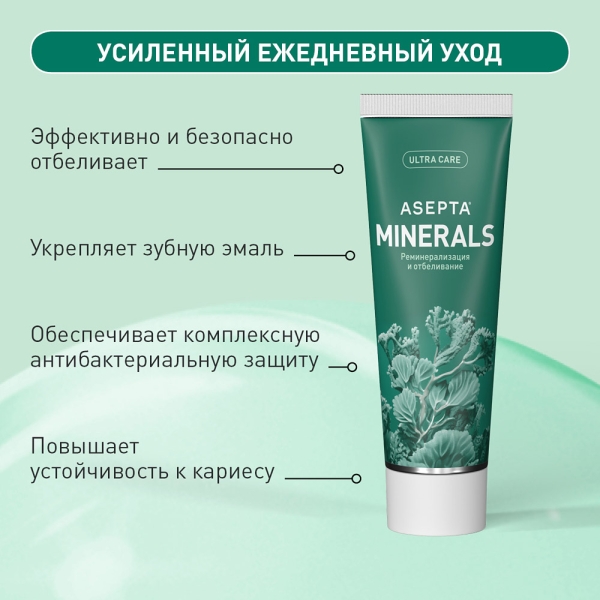 Ферментативная зубная паста ASEPTA Реминерализация и отбеливание предназначена для бережного ежедневного укрепления зубов. Паста насыщает зубную эмаль минералами и повышает её устойчивость к кариесу, эффективно отбеливает и обеспечивает комплексную антибактериальную защиту изо дня в день.