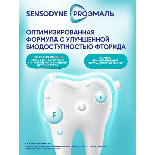Эмаль молочных зубов в 2 раза тоньше эмали постоянных зубов. Каждый день молочные зубы подвергаются воздействию пищевых кислот из еды и напитков, что делает зубы более уязвимыми для кариеса и эрозии эмали. Детская зубная паста SENSODYNE PRO ЭМАЛЬ KIDS со вкусом "Клубничный коктейль" разработана при участии стоматологов специально для ухода за молочными зубами с 2-х лет. Она обеспечивает качественное очищение и удаление бактериального налета, защищает от кариеса и кислотной эрозии, а также эффективно укрепляет эмаль молочных зубов. Зубная паста с содержанием фторида 1000 psn и формулой, оптимизированной для его лучшего усвоения, помогает сохранять здоровье детских зубов.