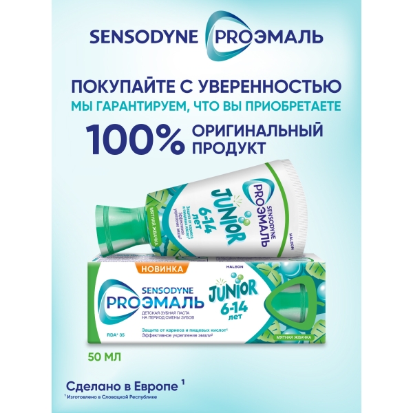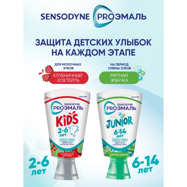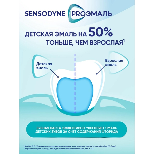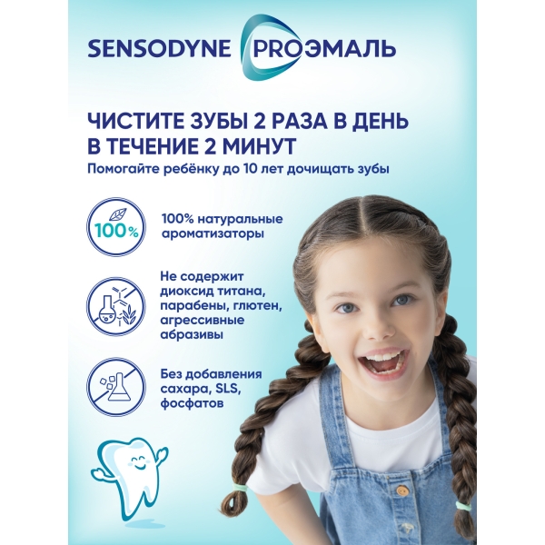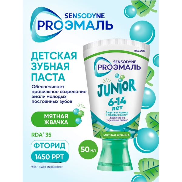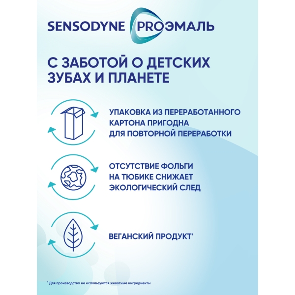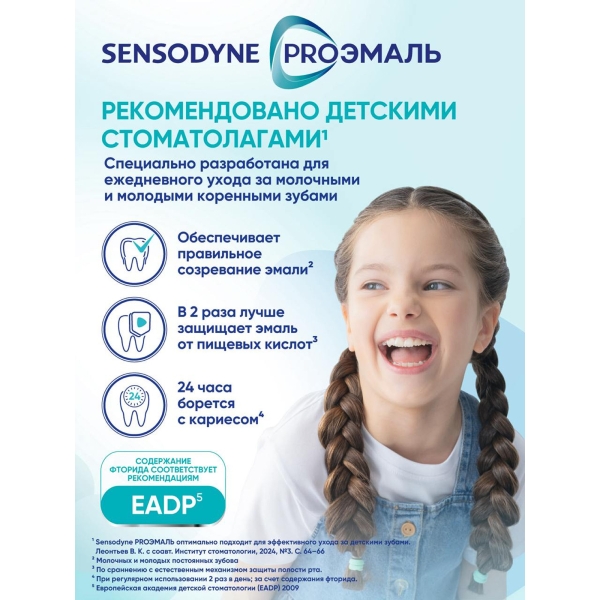 Детская зубная паста SENSODYNE PRO ЭМАЛЬ JUNIOR со вкусом "Мятная жвачка" специально разработана при участии стоматологов для ухода за зубами детей с 6-ти лет. Она обеспечивает качественное очищение и удаление бактериального налета 4, защищает зубы от воздействия пищевых кислот и от кариеса, а также эффективно укрепляет эмаль.