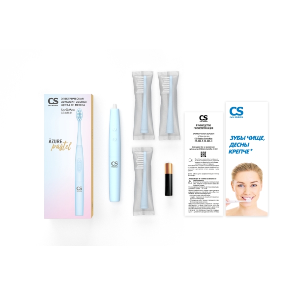Рукоятка с насадкой звуковой щетки CS SonicMax CS-888-H, голубая, дополнительные насадки, 2 шт, элемент питания типа AAA, руководство по эксплуатации, гарантийный талон