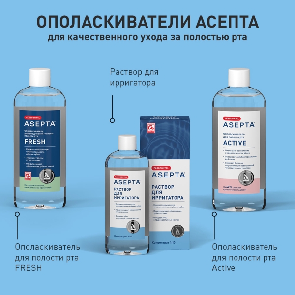 Использование ирригатора вместе с раствором ASEPTA существенно повышает качество и эффективность гигиены полости рта, особенно при ношении брекетов и зубных протезов.