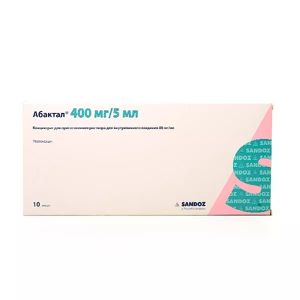В/в препарат назначают в виде инфузии в дозе 400 мг каждые 12 ч; продолжительность инфузии - 1 ч. Предварительно содержимое одной ампулы (400 мг) разбавляют 250 мл 5% раствора декстрозы (глюкозы). Абактал нельзя разбавлять раствором натрия хлорида или любым растворителем, содержащим ионы хлора.