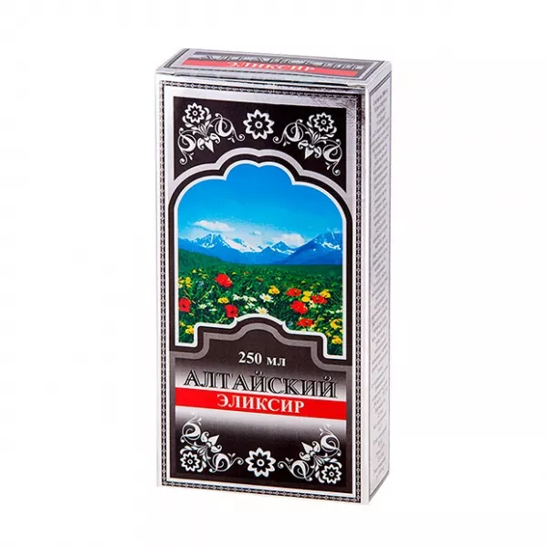 Эликсир в виде жидкости коричневого цвета, со специфическим запахом; допускается образование осадка. водно-спиртовое извлечение "Алтайский" (из 24 видов лекарственного сырья: семян сосны кедровой сибирской, листьев брусники, корней и корневищ родиолы розовой, плодов шиповника, корневищ бадана, корней солодки, цветков ромашки, травы душицы, листьев толокнянки, плодов черемухи, корней и корневищ элеутерококка, травы зверобоя, цветков боярышника, плодов боярышника, листьев шалфея, листьев подорожника большого, травы тысячелистника, корневищ с корнями рапонтикума сафлоровидного, корневищ лапчатки, плодов кориандра, чаги, травы полыни горькой, корневищ с корнями пиона уклоняющегося, плодов аронии черноплодной)