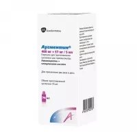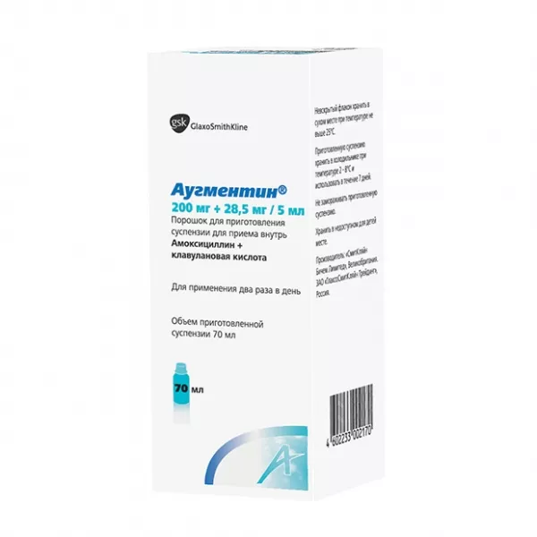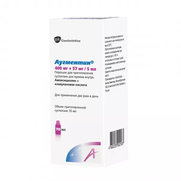 ?Инструкция для приготовления суспензии порошок, содержащийся во флаконе, развести до образования суспензии, как описано далее. Налить в бутылочку с порошком кипяченой воды до нижнего обозначенного линией со стрелкой уровня, закрыть крышечкой и встряхнуть бутылочку до образования суспензии. Дать постоять суспензии на протяжении 5 мин до полной дисперсии. Добавить воды до верхнего обозначенного линией со стрелкой уровня и встряхнуть снова. При разведении образуется суспензия белого цвета с желтоватым или слегка сероватым оттенком. После приготовления суспензии ее следует хранить в холодильнике при температуре от 2 до 8 °C на протяжении 7 дней. При лечении детей в возрасте до 2 лет сироп Аугментина можно наполовину разводить водой.