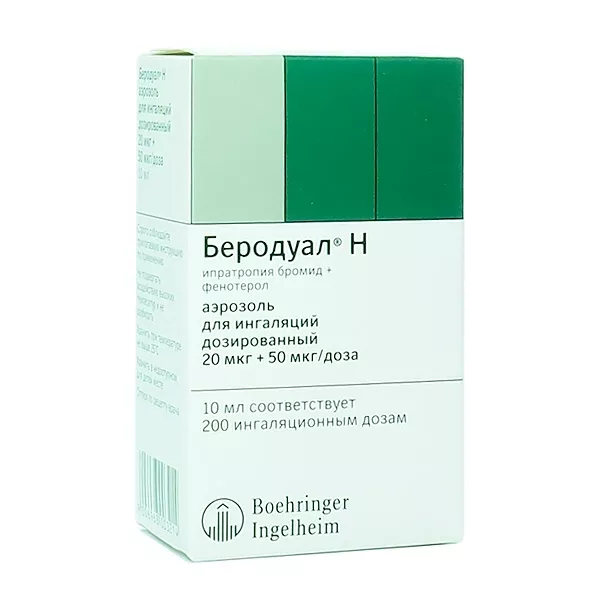 При совместном применении ипратропия бромида и фенотерола бронхорасширяющий эффект достигается путем воздействия на различные фармакологические мишени. Указанные вещества дополняют друг друга, в результате усиливается спазмолитический эффект на мышцы бронхов и обеспечивается большая широта терапевтического действия при бронхолегочных заболеваниях, сопровождающихся констрикцией дыхательных путей. Взаимодополняющее действие таково, что для достижения желаемого эффекта требуется более низкая доза бета-адренергического компонента, что позволяет индивидуально подобрать эффективную дозу при практическом отсутствии побочных эффектов препарата Беродуал®.