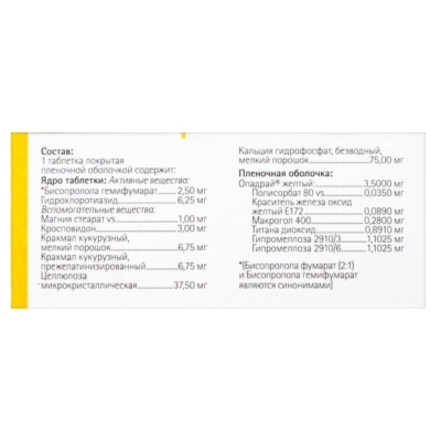 действующее вещество: бисопролола фумарат 2,5, 5 мг и 10 мг.