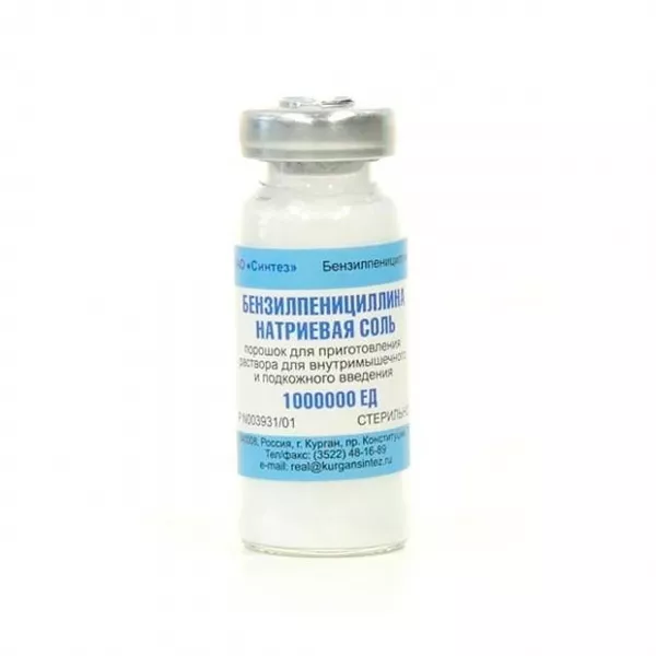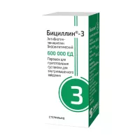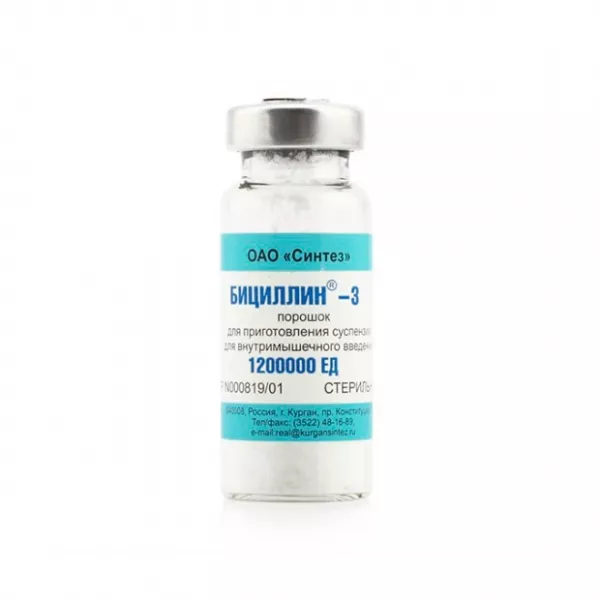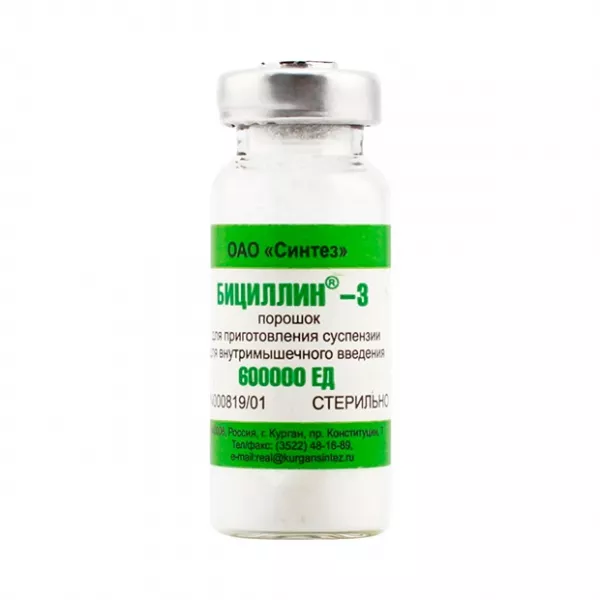 1 флакон (Бициллин−1) с порошком для приготовления инъекционного раствора для в/м введения содержит бензатина бензилпенициллина 600000 ЕД или 1200000 ЕД.