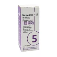 1 флакон вместимостью 10 мл (Бициллин−5) с порошком для приготовления инъекционного раствора для в/м введения содержит бензатина бензилпенициллина 1200000 ЕД и бензилпенициллина новокаиновой соли 300000 ЕД.