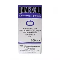 Наружно. Применяется в виде компрессов, тампонов в основном в водных растворах 30-50% концентрации. При назначении лечении рожи и трофических язв димексид применяют в 30-50% водных растворах по 50-100мл 2-3 раза в день. При экземе, диффузных стрептодермиях рекомендуются компрессы с 40-90% раствором димексида. При гнойничковых заболеваниях кожи применяют 40% раствор димексида. Для местного обезболивания при болевых синдромах назначают 25-50% раствор в виде компрессов по 100-150мл 2-3 раза в день. При лечении глубоких ожогов применяют повязки с 20-30% раствором димексида.