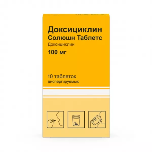 Действующее вещество: доксициклина моногидрат – 104,00 мг, в пересчете на доксициклин – 100,00 мг.
