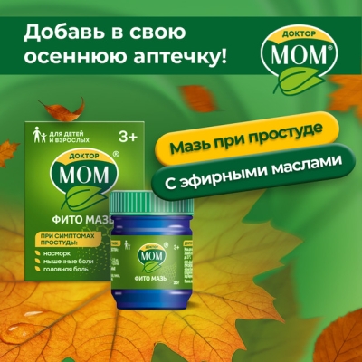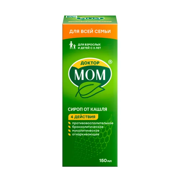 Доктор Мом - комбинированный препарат, состоящий из растворов натуральных эфирных масел. Доктор МОМ оказывает местнораздражающее, "отвлекающее", вазодилатирующее, вторичное анальгезирующее и противовоспалительное действие. При местном применении его действие характеризуется ощущением глубокого проникающего тепла, которое затем сменяется охлаждающим и обезболивающим эффектом. Пары эфирных масел, которые выделяются под действием тепла кожи, обладают противовоспалительным действием.