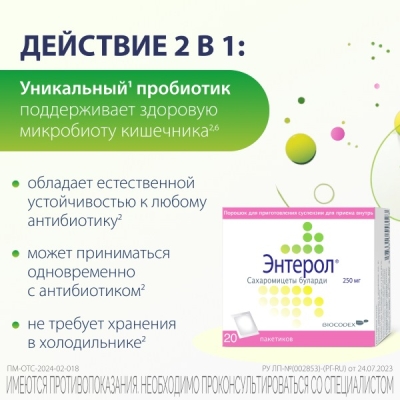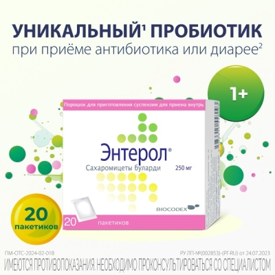 1 пакетик саше содержит лиофилизированных Saccharomyces boulardii 250 мг; в коробке 10 шт, 20 шт.