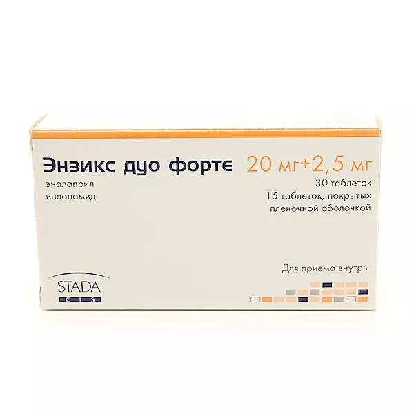 ЭНЗИКС: 1 таблетка Энaлaприла (10 мг) и 1 таблетка покрытая пленочной оболочкой Индапамида (2,5 мг) принимаются внутрь, утром одновременно. В зависимости от динамики показателей артериального давления доза Эналаприла может быть увеличена до двухкратного приема в сутки. Максимальная суточная доза Эналаприла составляет 40 мг, Индапамида — 2,5 мг.