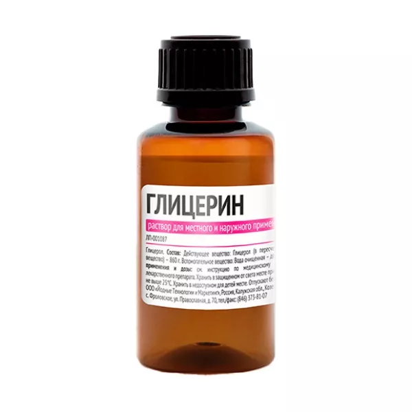 Глицерин — это лекарственное средство, оказывающее смягчающее действие. Широко применяется в медицине и косметологии. Показан к применению при сухости кожных покровов и склонности кожи к раздражению. Обладает способностью задерживать воду и предохраняет кожу от чрезмерного высушивания.
