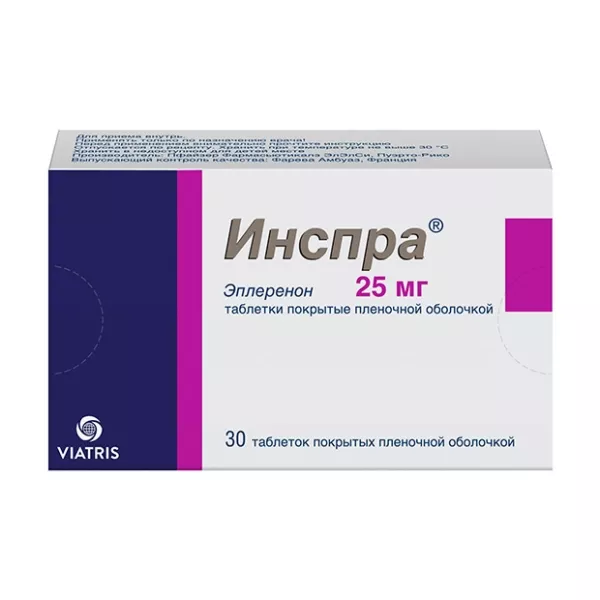 Опыта применения препарата Инспра® у пациентов с сердечной недостаточностью после перенесенного инфаркта миокарда и КК <50 мл/мин нет. Следует с осторожностью применять препарат Инспра® у таких пациентов. У пациентов с КК <50 мл/мин применение препарата Инспра® в дозе выше 25 мг 1 раз/сут не исследовалось.
