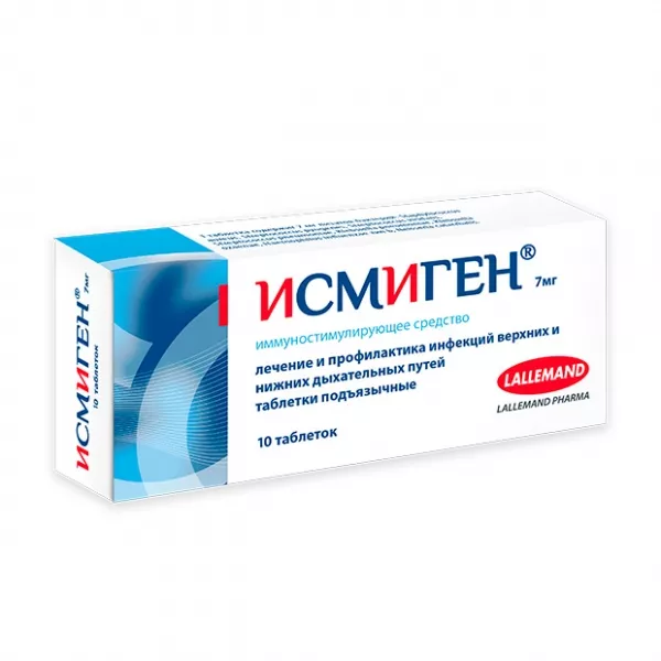 Комбинированный иммуностимулирующий препарат бактериального происхождения для сублингвального (подъязычного) приема. Представляет собой поливалентный антигенный комплекс, включающий лизаты бактерий - наиболее часто встречающихся возбудителей респираторных инфекций. Лизаты, входящие в состав препарата Исмиген®, получены путем механического разрушения бактериальных клеток. Исмиген® оказывает неспецифическое иммуностимулирующее и специфическое вакцинирующее действие.
