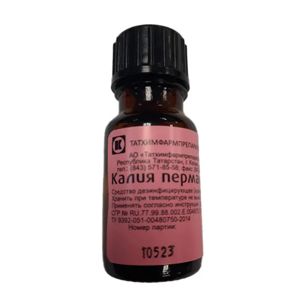 Даже при высоком разведении раствор калия перманганата при наружном применении окрашивает кожу в коричневый цвет. Симптомы интоксикации, которые могут развиться при приеме внутрь раствора калия перманганата в чрезмерно высокой концентрации: тошнота, рвота с коричневатой примесью; разъедание, отек, коричневая окраска слизистой оболочки полости рта, желудочно-кишечное кровотечение, повреждение печени и почек, угнетение деятельности сердца.