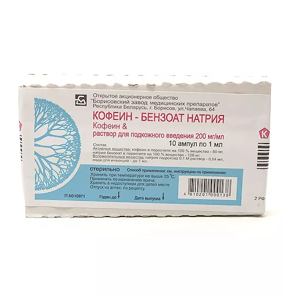 Внутрь (независимо от приема пищи). Взрослым — по 0,05–0,1 г на прием 2–3 раза в день (не более 1 г в сутки), детям старше 2 лет — по 0,03–0,075 г на прием; при мигрени (часто в сочетании с ненаркотическими анальгетиками и алкалоидами спорыньи) — по 1–2 табл. во время приступа боли, затем — по 1 табл. 2–3 раза в день в течение нескольких дней (до 1 мес). В виде кофеин-бензоата натрия вводится п/к: взрослым — по 1 мл 10% или 20% раствора, детям — по 0,25–1 мл 10% раствора. Для устранения апноэ у новорожденных — вводят через рот или в/в (в виде кофеин-цитрата), создавая концентрацию кофеина-основания в плазме крови от 3 до 10 мг/мл.