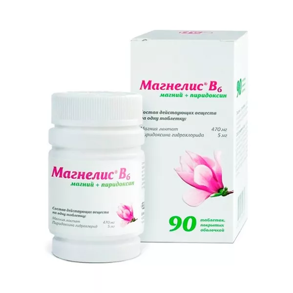 Магнелис В6 таблетки №50, №90. В составе 1 таблетки содержатся: активные вещества: дигидрат лактата магния – 470 мг (в пересчете на Mg2+ – 48 мг); гидрохлорид пиридоксина – 5 мг; вспомогательные компоненты (ядро): каолин – 41 мг; сахароза – 27,4 мг; стеарат магния – 6,8 мг; тальк – 6,8 мг; кармеллоза натрия – 34 мг; камедь акации – 25 мг; коллидон SR (поливинилацетат – 80%; повидон – 19%; лаурилсульфат натрия – 0,8%; диоксид кремния – 0,2%) – 34 мг; оболочка: тальк – 15 мг; сахароза – 166,7 мг; диоксид титана – 9 мг; желатин – 0,9 мг; пчелиный воск – 0,4 мг; камедь акации – 4 мг; каолин – 54 мг.
