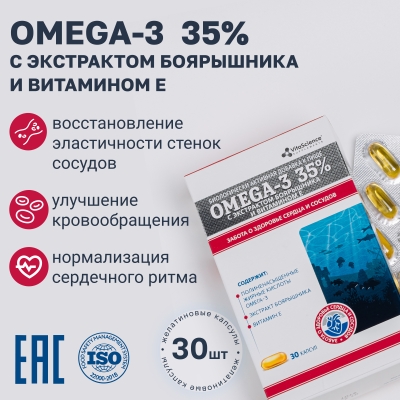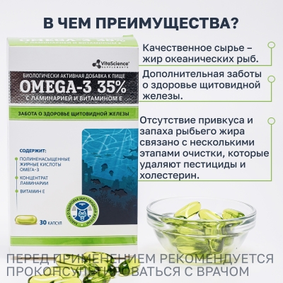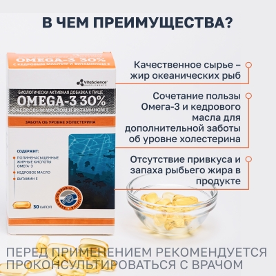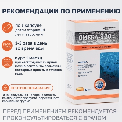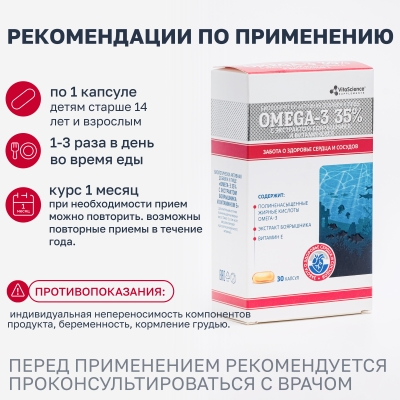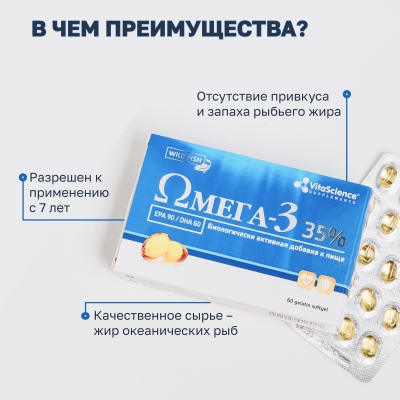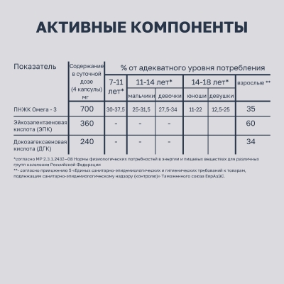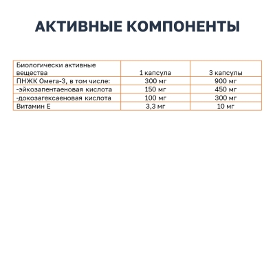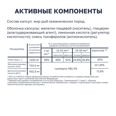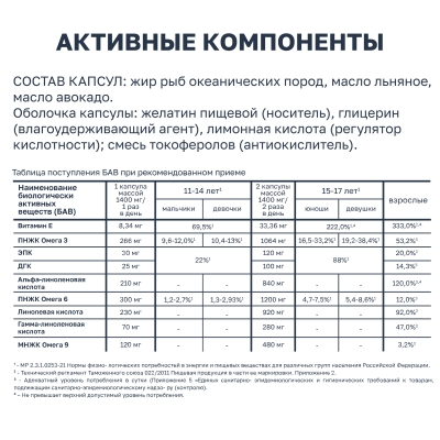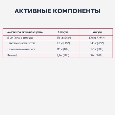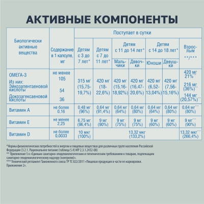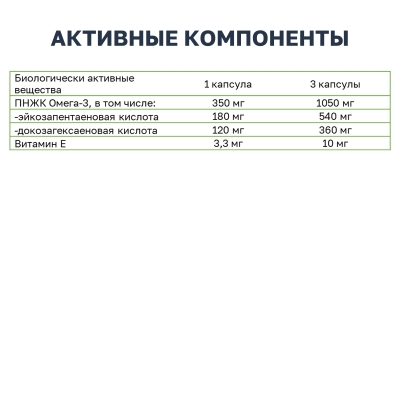 Дополнительный источник полиненасыщенных жирных кислот омега-3, в том числе эйкозапентаеновой, докозагексаеновой кислот.