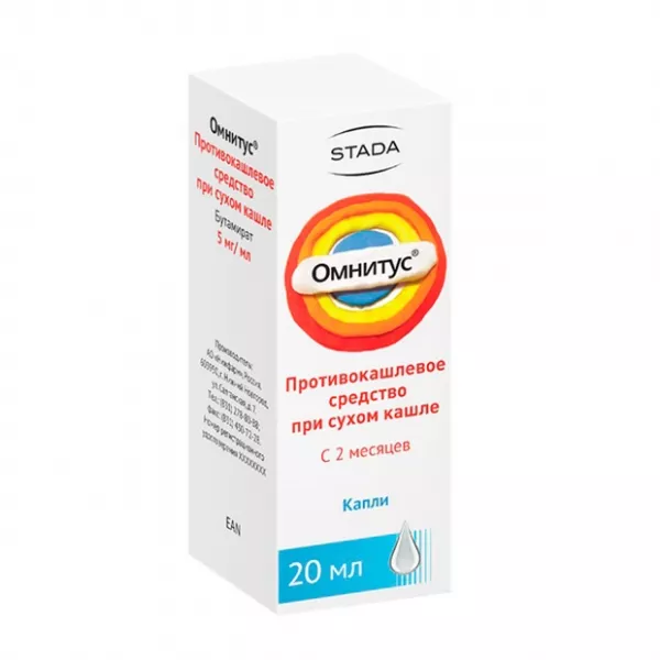 Бутамират, активное вещество препарата Омнитус®, является противокашлевым средством центрального действия. Ни химически, ни фармакологически не относится к алкалоидам опия. Не формирует зависимости или привыкания. Подавляет кашель, обладая прямым влиянием на кашлевой центр. Оказывает бронходилатирующий эффект (расширяет бронхи). Способствует облегчению дыхания, улучшая показатели спирометрии (снижает сопротивление дыхательных путей) и оксигенации крови (насыщает кровь кислородом).