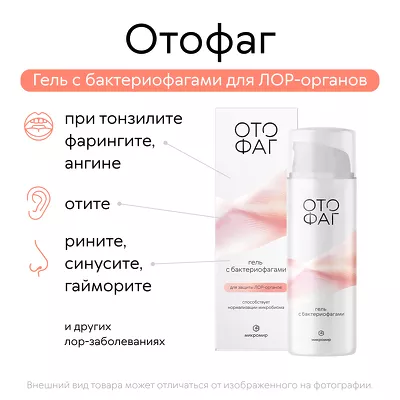 Гель с бактериофагами для гигиены кожи ушных раковин «Отофаг» (далее - Отофаг) применяют с целью нормализации микрофлоры и профилактики бактериальных воспалительных заболеваний уха, в том числе, при заболеваниях других ЛОР-органов.