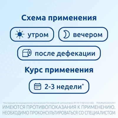 Суппозитории применяют по 1 шт. утром и вечером, а также после каждого акта дефекации.