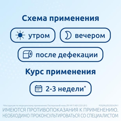 Мазь следует наносить тонким слоем на пораженный участок кожи и слизистой оболочки утром и вечером, а также после каждого акта дефекации. Для более глубокого введения мази в анальное отверстие можно использовать навинчивающийся аппликатор, прилагаемый к комплекту.