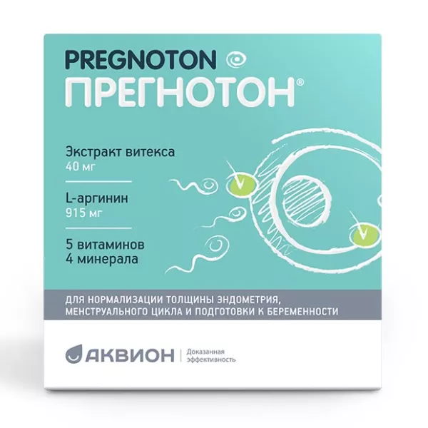 Прегнотон – препарат для подготовки к беременности. Улучшает функциональное состояние женской репродуктивной системы; снижает относительно повышенный уровень пролактина и позволяет нормализовать менструальный цикл 1,2; восполняет недостаток витаминов и минералов, необходимых для правильного формирования и развития плода на ранних стадиях беременности2; способствует восстановлению организма после стрессов, повышенных эмоциональных нагрузок; не вызывает снижения АД и может применяться при гипотонии.