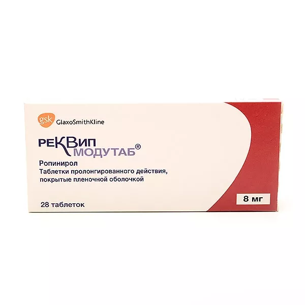 Пренарат Реквип Модутаб® выпускается в виде таблеток пролонгированного действия, покрытых пленочной оболочкой, со свойством высвобождения действующего вещества в течение 24 ч. В случае быстрого прохождения препарата через ЖКТ существует риск неполного высвобождения лекарственного вещества и перехода его остатка в стул