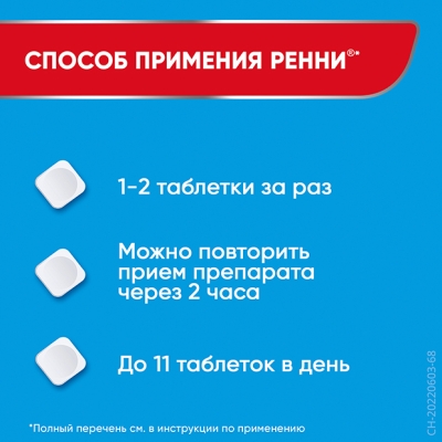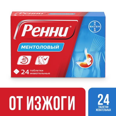 1 таблетка Ренни® без сахара (мятная) содержит 400 мг сорбитола и может назначаться пациентам с сахарным диабетом.