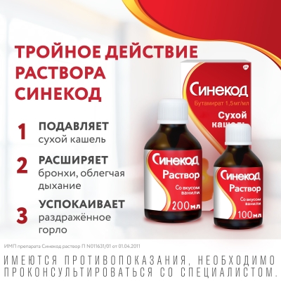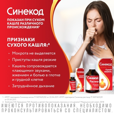 Синекод® может вызывать сонливость, поэтому следует проявлять осторожность при управлении автотранспортом и при выполнении работы, требующей концентрации внимания (например, при работе с механизмами) после приема препарата.