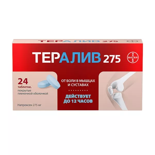 Препарат Тералив 275 представляет собой напроксен, обладает обезболивающим, жаропонижающим и противовоспалительным действием. Механизм действия связан с неселективным ингибированием активности циклооксигеназы-1 и -2 (ЦОГ-1, ЦОГ-2).