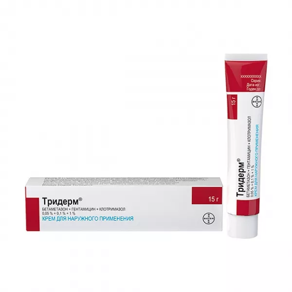 Тридерм мазь для наружного применения: 1 г мази содержит действующие вещества: бетаметазона дипропионат 640 мкг (в т.ч. бетаметазона - 500 мкг), клотримазол - 10 мг, гентамицин (в форме сульфата) - 1 мг;
