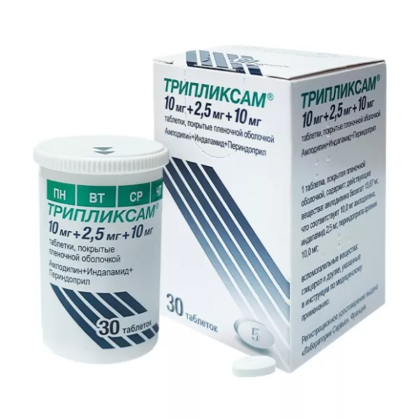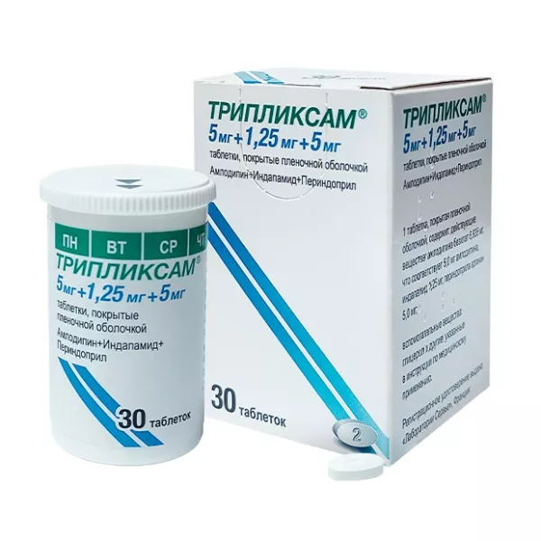 Трипликсам® - комбинированный препарат, включающий в себя три антигипертензивных компонента, каждый из которых дополняет действие других по контролю артериального давления у пациентов с артериальной гипертензией. Амлодипин — блокатор «медленных» кальциевых каналов (БМКК), производное дигидропиридина, индапамид — сульфонамидный диуретик, периндоприла аргинин — ингибитор фермента, превращающего ангиотензин I в ангиотензин II (ингибитор АПФ)