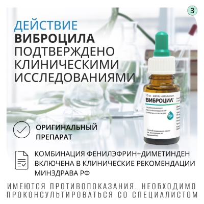 Как и в случае применения любых местных сосудосуживающих средств, следует соблюдать осторожность при назначении препарата Виброцил® пациентам с выраженными реакциями на симпатомиметики, проявляющимися в виде бессонницы, головокружения, тремора, сердечной аритмии или повышения АД.
